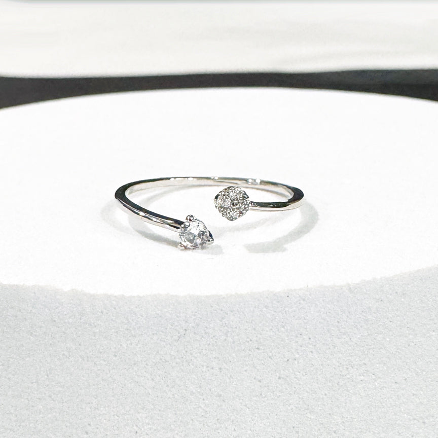 Minimal with a touch of brilliance, this adjustable crystal ring is a simple design made everyday sparkle. Featuring two shimmering stones in a delicate open design—one classic round-cut and one subtly elevated accent—it creates a balanced, modern look that feels both clean and eye-catching.