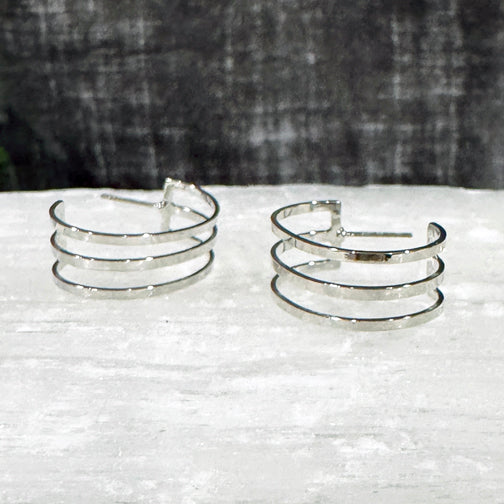 Two curved flat bars are suspended from thin metal ear wires, making these hoop earrings both...